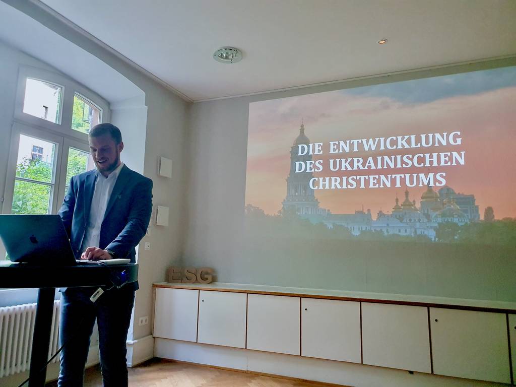 An einem lauen Mittwochabend ist der Saal im Karl-Jaspers-Haus in der Plöck 66 gut gefüllt. Viele Interessierte sind gekommen, um den Vortrag des Ukrainers Bohdan Mostovyi zur Entwicklung des ukrainischen Christentums zu hören.